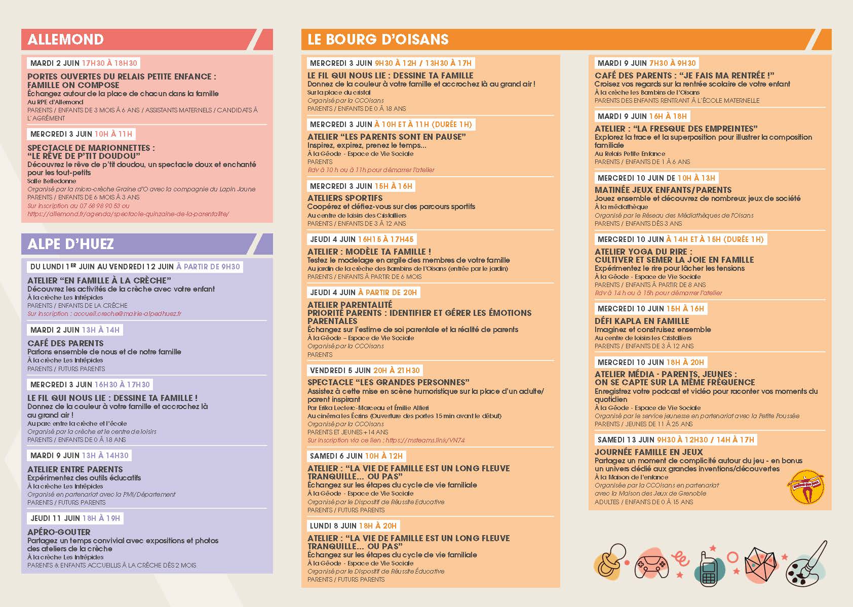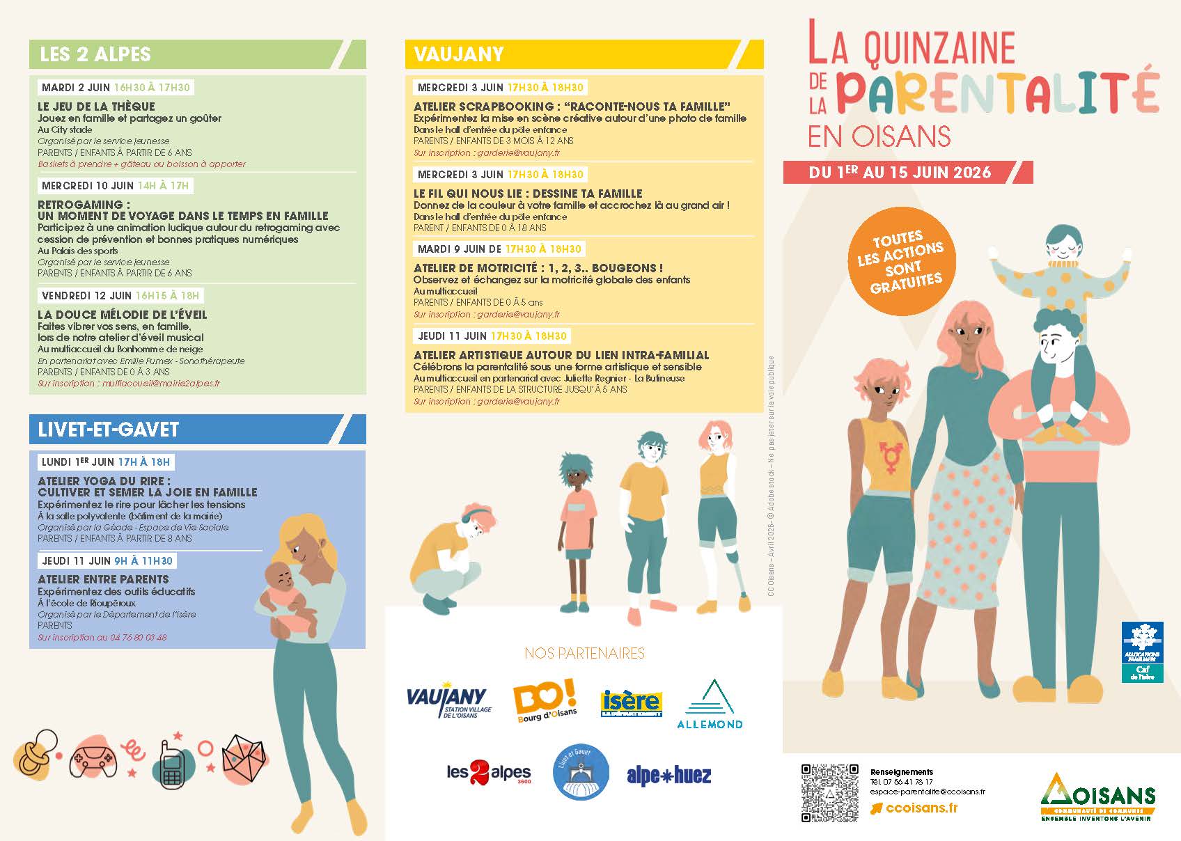 La Communauté de communes, les services du Département de l’Isère et des communes du territoire en partenariat avec la Caf – Allocations familiales de l’Isère vous invitent à cette nouvelle édition de la Quinzaine de la parentalité en Oisans.